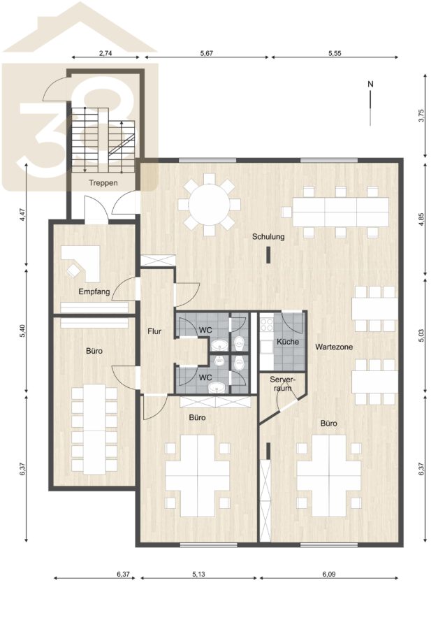 Im zweiten Obergeschoss eines gepflegten Gebäudes aus dem Jahr 2007 befindet sich diese moderne und großzügige Bürofläche mit einer Gesamtgröße von rund 230 m². Die hellen Räume überzeugen durch ihre freundliche Atmosphäre und bieten eine flexible Aufteilung, die sowohl klassische Büronutzung als auch offene Arbeitskonzepte ermöglicht. Großzügige Fensterfronten sorgen für viel Tageslicht und ein angenehmes Raumgefühl, während der Teppichboden für eine gute Akustik und ein repräsentatives Erscheinungsbild sorgt.