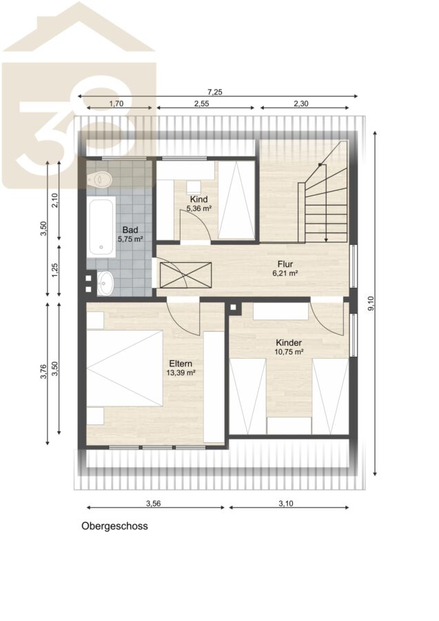 Über den Treppenaufgang gelangen Sie in das Obergeschoss. Ein weiteres Schlafzimmer sowie zwei flexibel nutzbare Kinder- oder Arbeitszimmer stehen Ihnen hier zur Verfügung. Das Badezimmer im Obergeschoss ist mit einer Badewanne einem WC sowie einem Fenster, das für eine gute Belüftung sorgt, ausgestattet.