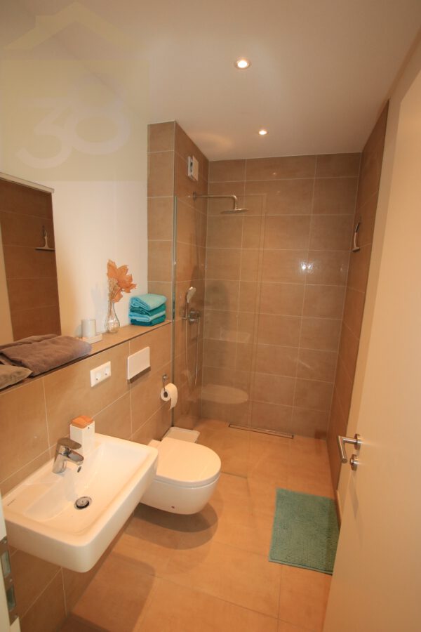 Schon beim Betreten des Hauses empfängt Sie ein freundlicher, lichtdurchfluteter Eingangsbereich mit Garderobe. Im Erdgeschoss befindet sich ein flexibel nutzbares Gäste- oder Arbeitszimmer mit direktem Zugang zum Garten. Das angrenzende Duschbad und der Hauswirtschaftsraum mit Waschmaschine und Trockner sorgen für zusätzlichen Komfort im Alltag.