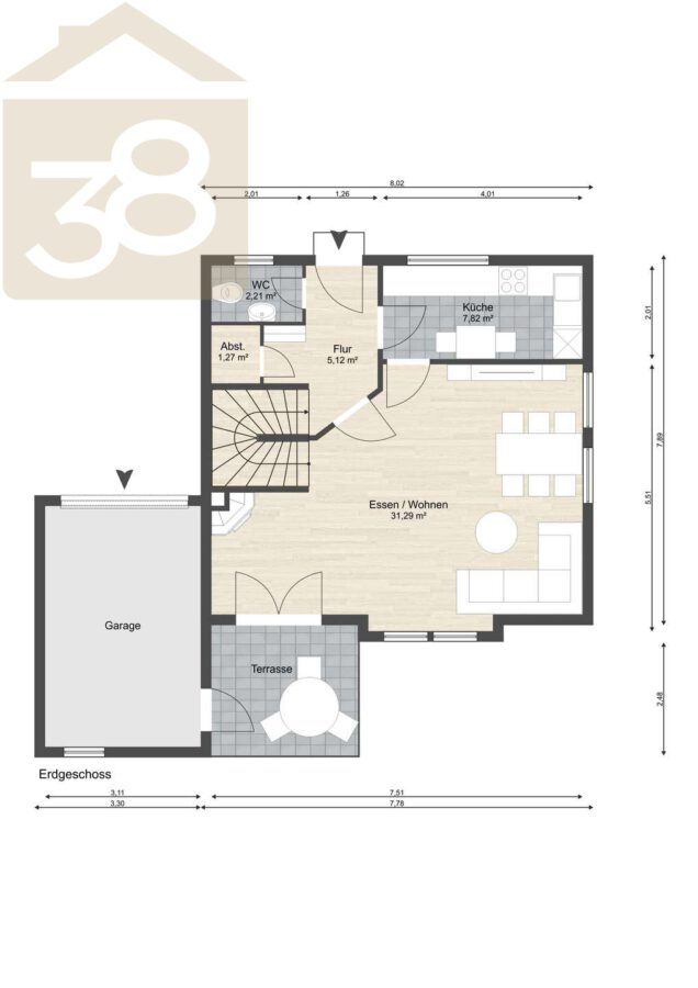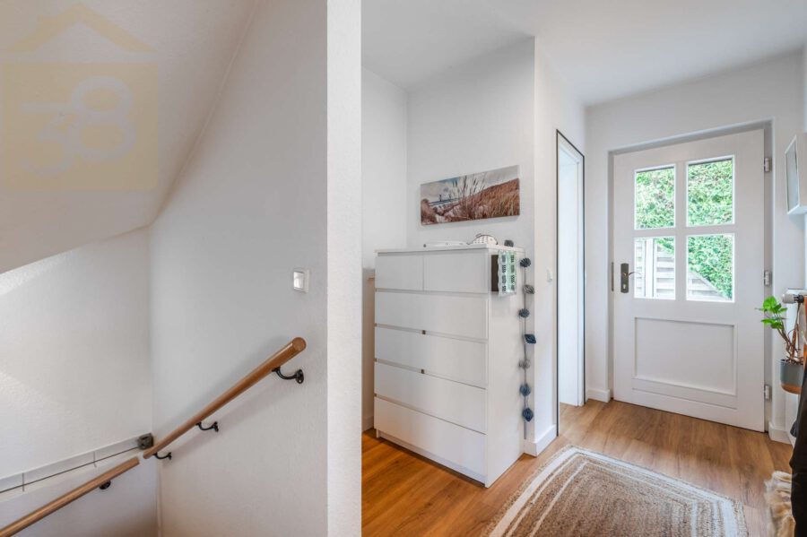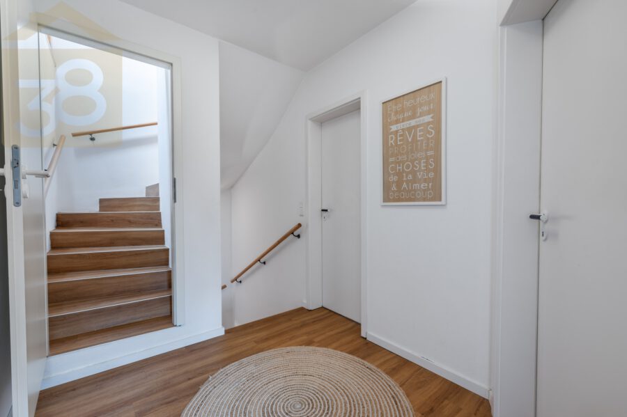 Bereits beim Betreten des Hauses gelangen Sie in einen einladenden Flur im Erdgeschoss, von dem aus alle Räume bequem erreichbar sind. Hier befinden sich ein Gäste-WC sowie ein praktischer Abstellraum, der zusätzlichen Stauraum bietet. Die Küche ist mit einer hochwertigen Einbauküche inklusive Markengeräten ausgestattet und ermöglicht komfortables Kochen im Alltag. Herzstück des Erdgeschosses ist der großzügige Wohn- und Essbereich, der durch seine Helligkeit und Offenheit besticht. Ein Kaminofen sorgt hier zusätzlich für eine behagliche Atmosphäre. Von diesem Bereich aus haben Sie direkten Zugang zur Terrasse, die zu entspannten Stunden im Freien einlädt. Über die Terrasse gelangen Sie ebenfalls direkt in die Garage, was kurze und komfortable Wege ermöglicht. In der Garage befindet sich zudem eine installierte Wallbox, die das bequeme Laden eines Elektrofahrzeugs direkt am Haus ermöglicht.