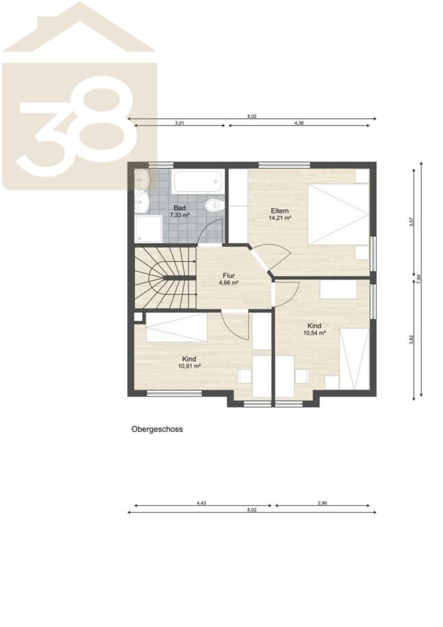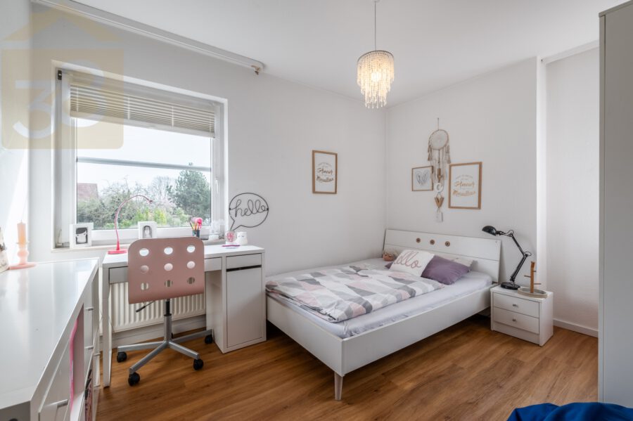 Im Obergeschoss stehen Ihnen ein geräumiges Schlafzimmer sowie zwei gut geschnittene Kinderzimmer zur Verfügung. Das Badezimmer ist mit einer Eckbadewanne, einer Dusche, einem WC, einem Fenster sowie einem Waschtisch ausgestattet.