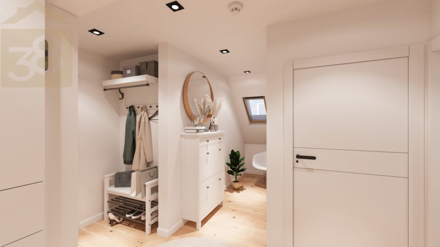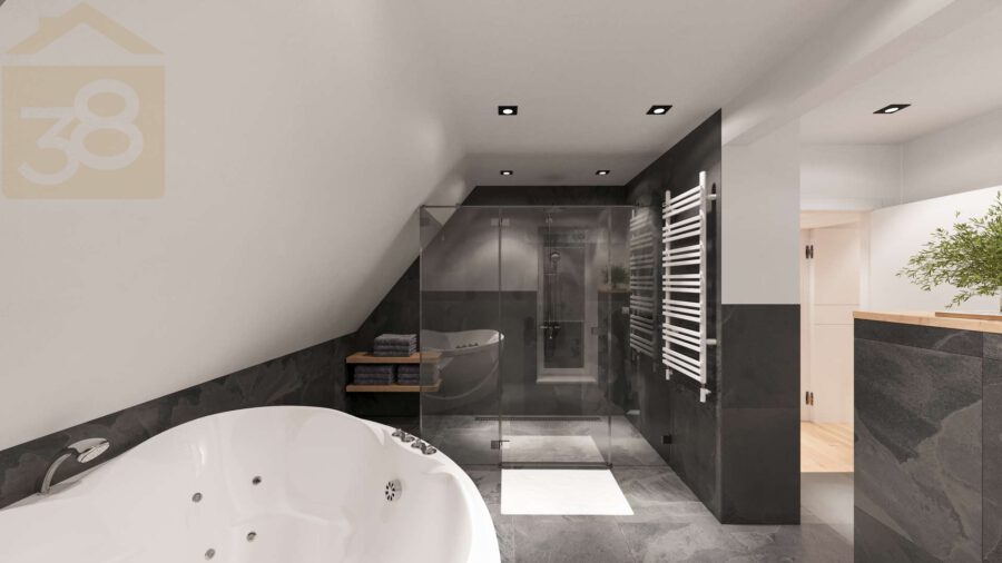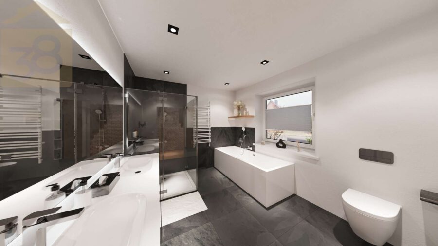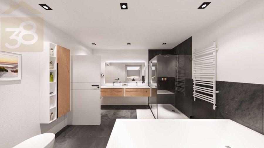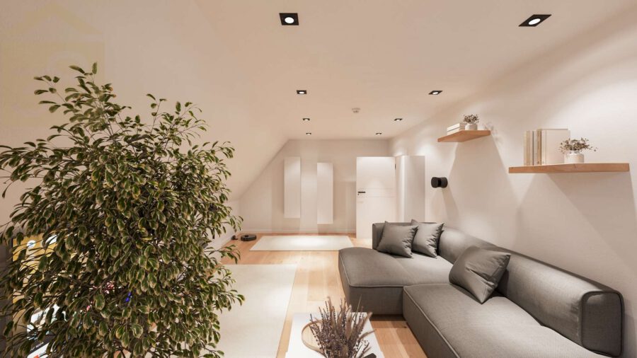 Das Dachgeschoss erweitert das Platzangebot um drei weitere Zimmer, die flexibel als Schlaf-, Hobby- oder Arbeitsräume genutzt werden können. Zusätzlich steht hier ein großes Badezimmer zur Verfügung, sodass auch im oberen Bereich hoher Wohnkomfort gewährleistet werden kann.