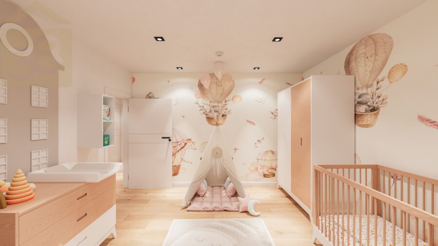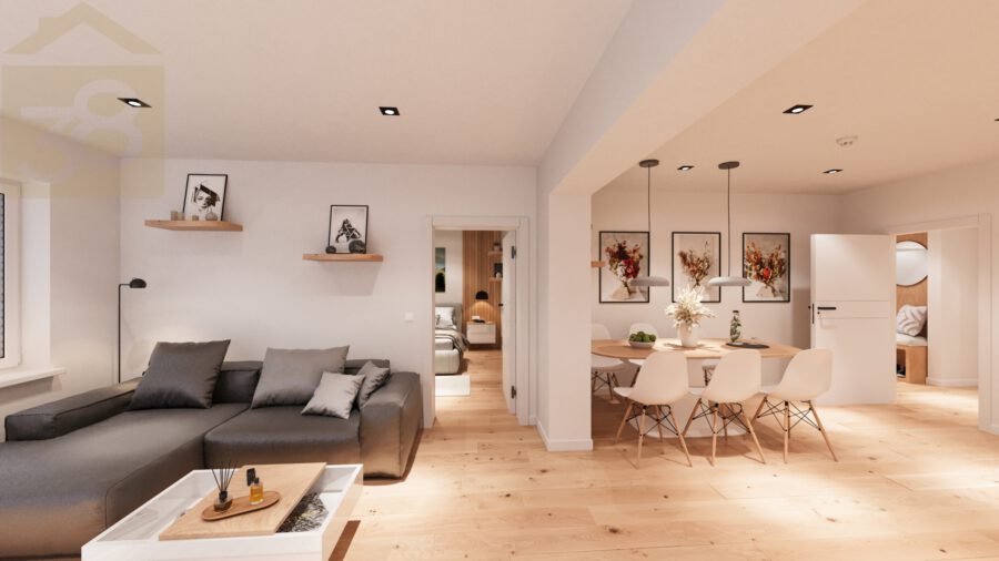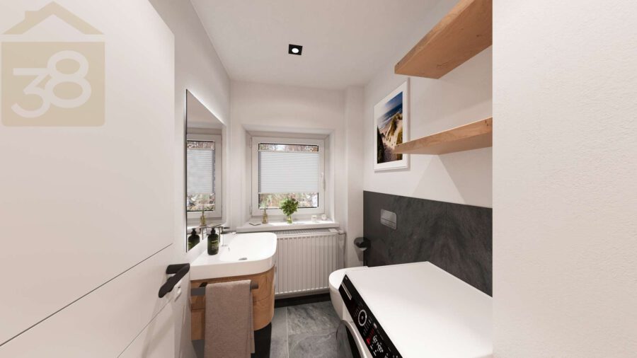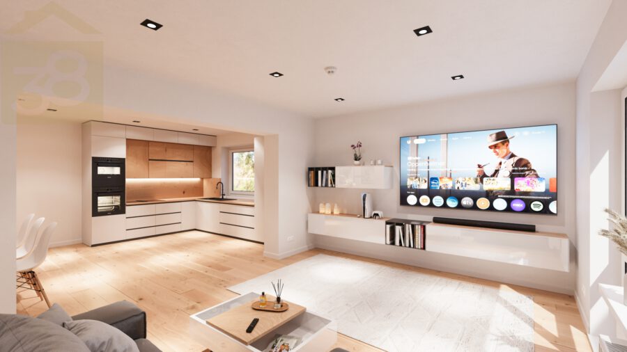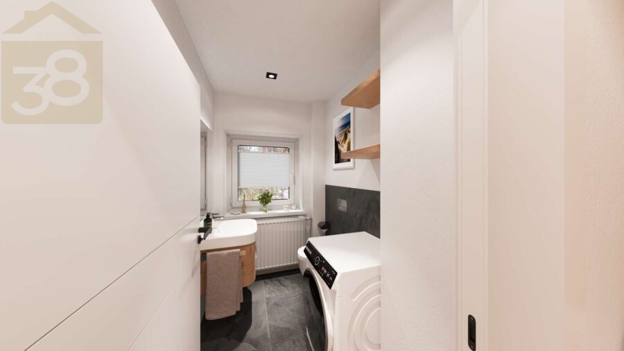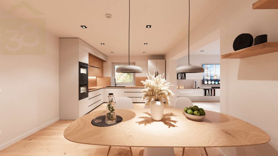 Im Erdgeschoss eröffnet sich ein gut geschnittener Grundriss mit einem großen Wohn- und Esszimmer als zentralem Mittelpunkt des Familienlebens. Darüber hinaus stehen ein Elternschlafzimmer sowie zwei Kinderzimmer zur Verfügung, die flexibel als Schlaf-, Arbeits- oder Spielräume genutzt werden können. Ein Gäste-WC ist vorhanden. Das vollwertige Badezimmer ist mit Dusche und Badewanne ausgestattet.