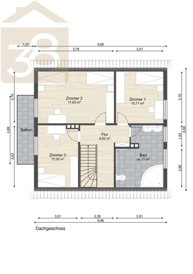 Das Dachgeschoss erweitert das Platzangebot um drei weitere Zimmer, die flexibel als Schlaf-, Hobby- oder Arbeitsräume genutzt werden können. Zusätzlich steht hier ein großes Badezimmer zur Verfügung, sodass auch im oberen Bereich hoher Wohnkomfort gewährleistet werden kann.
