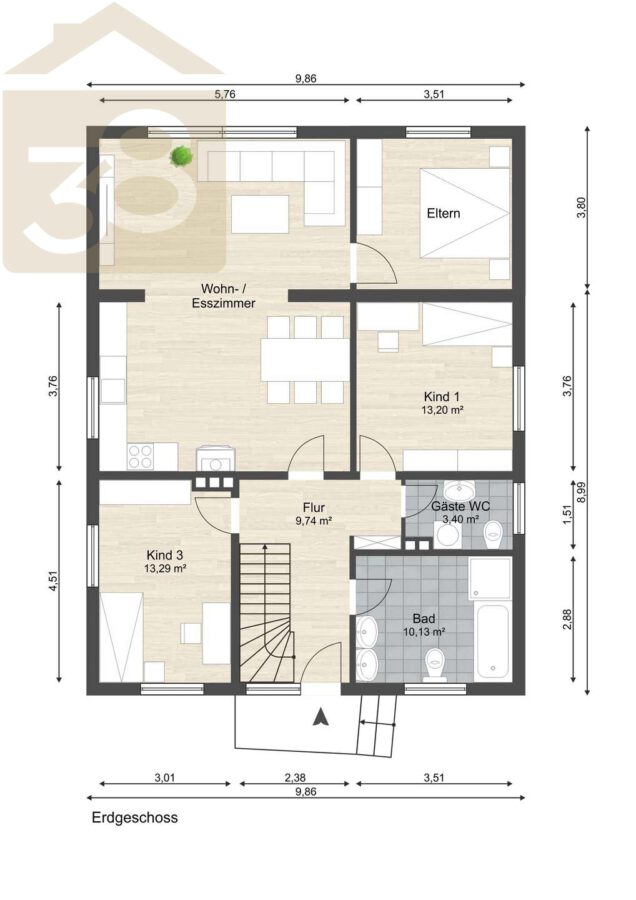 Im Erdgeschoss eröffnet sich ein gut geschnittener Grundriss mit einem großen Wohn- und Esszimmer als zentralem Mittelpunkt des Familienlebens. Darüber hinaus stehen ein Elternschlafzimmer sowie zwei Kinderzimmer zur Verfügung, die flexibel als Schlaf-, Arbeits- oder Spielräume genutzt werden können. Ein Gäste-WC ist vorhanden. Das vollwertige Badezimmer ist mit Dusche und Badewanne ausgestattet.