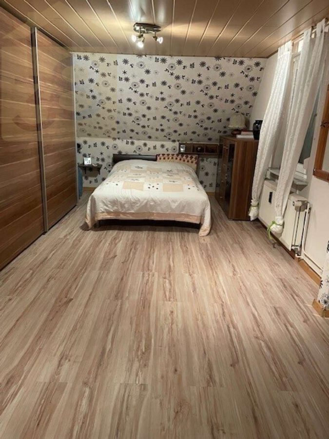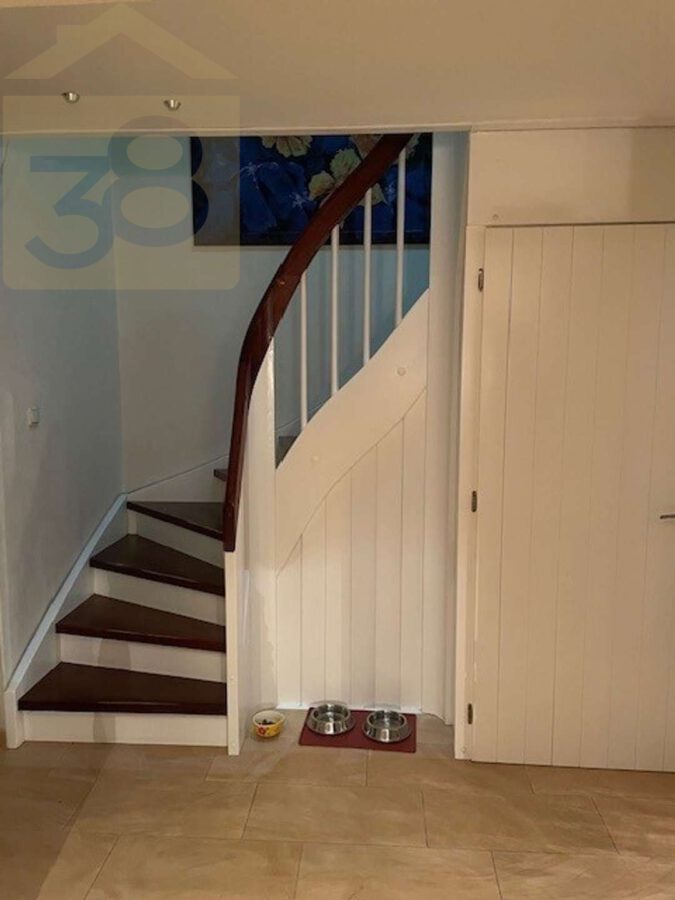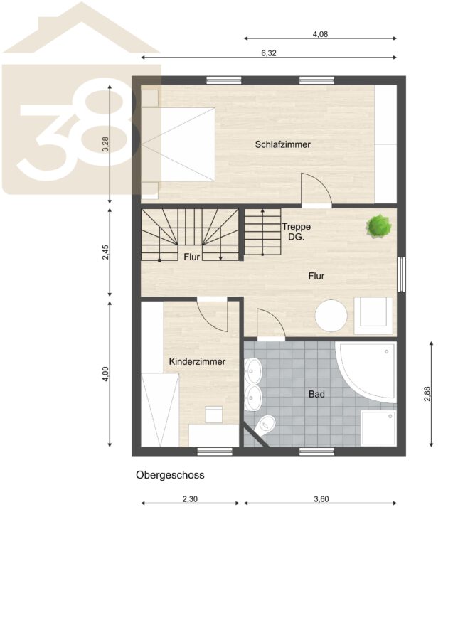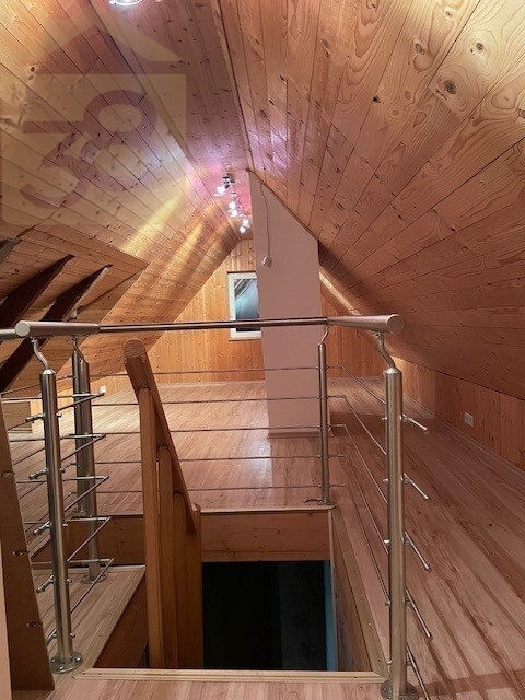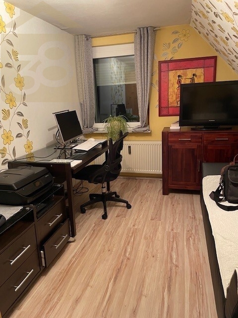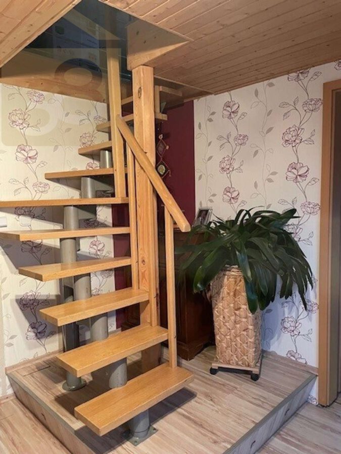 Über die Treppe zum Obergeschoss gelangt man in ein Schlafzimmer und ein zusätzliches Arbeits- oder Kinderzimmer. Das Badezimmer verfügt über eine Dusche und eine Eck-Badewanne. Der Dachboden ist mit Fenstern ausgebaut und bietet zusätzlichen Raum.