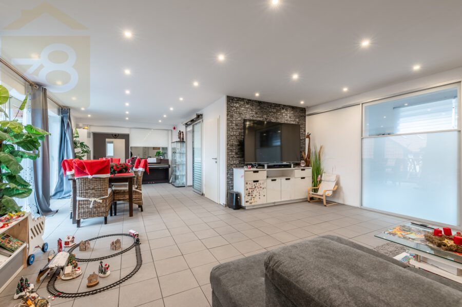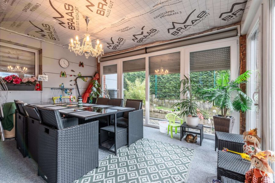 Das Erdgeschoss umfasst fünf Zimmer und bietet eine geräumige Küche mit Einbauküche, ein Badezimmer mit Dusche sowie direkten Zugang zur Terrasse und zum liebevoll angelegten Garten. Der Außenbereich ist ein echtes Highlight der Immobilie: Ein Pool, großzügige Grünflächen und Rückzugsmöglichkeiten schaffen eine private Wohlfühloase. Der Wintergarten erweitert den Wohnraum und ermöglicht zu jeder Jahreszeit einen Blick ins Grüne. Das Obergeschoss verfügt über ein großzügiges Wohn- und Esszimmer, ein Schlafzimmer sowie zwei weitere Zimmer, die sich ideal als Kinder-, Gäste- oder Arbeitszimmer nutzen lassen. Ergänzt wird diese Etage durch ein vollwertiges Badezimmer, einen Flur sowie einen praktischen Abstellraum. Insgesamt sind zwei Einbauküchen vorhanden, was die flexible Nutzung der Wohneinheiten zusätzlich unterstreicht.