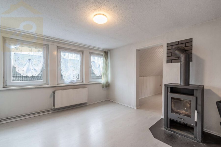 Besonders hervorzuheben sind das helle Wohnzimmer sowie das Schlafzimmer im Obergeschoss. Große Fensterflächen sorgen hier für einen wunderbaren Lichteinfall und schaffen eine offene, lichtdurchflutete Wohnqualität. Ein Kamin im oberen Wohnbereich rundet das behagliche Ambiente ab und lädt zu gemütlichen Abenden ein.