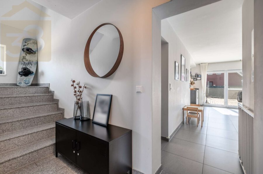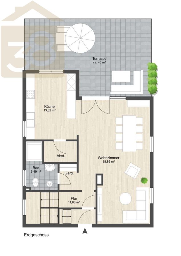 Im Erdgeschoss empfängt ein freundlicher Flur die Bewohner und Gäste. Herzstück des Hauses ist das großzügige Wohnzimmer mit direktem Zugang zur Terrasse, welches mit einem Kaminanschluss ausgestattet ist. Der offen gestaltete Essbereich geht harmonisch in die Küche mit Einbauküche über und schafft ein modernes, kommunikatives Wohngefühl. Ein Badezimmer mit WC und ebenerdiger Dusche ergänzt diese Ebene und bietet zusätzlichen Komfort.