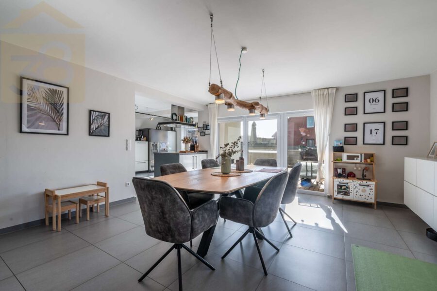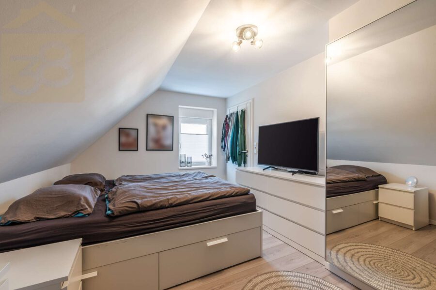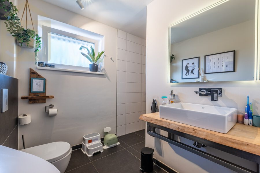 Das Dachgeschoss bildet den privaten Rückzugsbereich der Familie. Hier befinden sich ein geräumiges Schlafzimmer sowie zwei Kinderzimmer, von denen eines Zugang zum Balkon bietet. Das großzügige Badezimmer überzeugt mit einer Badewanne, einer ebenerdigen Dusche sowie zwei Waschtischen und bietet somit ausreichend Platz für den Alltag einer Familie.