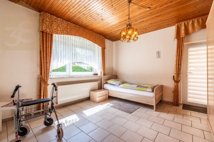 Im Erdgeschoss finden Sie ein Bad mit Badewanne und Dusche sowie ein Gäste-WC. Der Flur bietet Ihnen genug Platz für eine Garderobe, und die Küche lädt mit Platz für eine Essecke und einer Einbauküche älteren Baujahrs zum gemeinsamen Kochen ein. Zusätzlich gibt es ein Schlaf-, Arbeits- oder Gästezimmer sowie ein einladendes Wohnzimmer mit Zugang zur überdachten Terrasse.