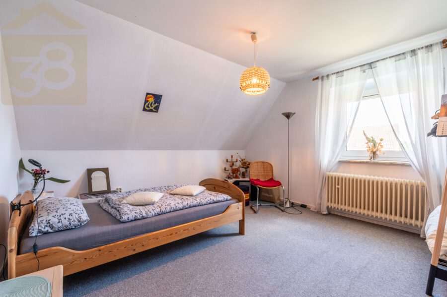 Im Obergeschoss erwarten Sie ein weiteres Bad mit Dusche, ein zentraler Flur, zwei Kinderzimmer sowie das Hauptschlafzimmer und ein zusätzliches Wohnzimmer. Zur Immobilie gehören auch eine Garage sowie Nebenräume, die als Hobbywerkstatt, Waschküche sowie Vorratsräume genutzt werden.