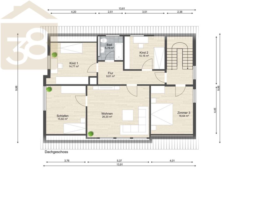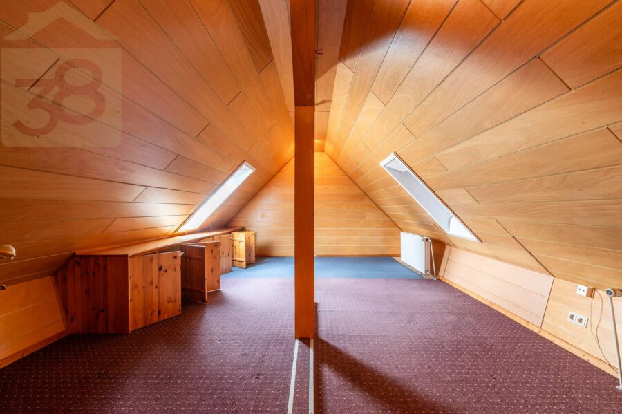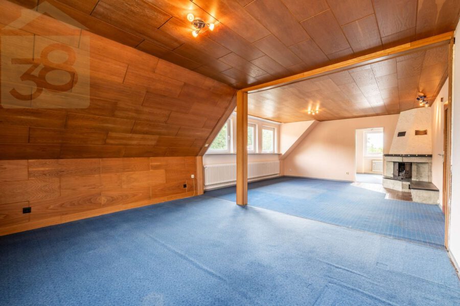 Das Dachgeschoss verfügt über ein weiteres Badezimmer mit einer Eckbadewanne sowie vier zusätzliche Zimmer, die flexibel als Schlaf-, Kinder-, Gäste- oder Arbeitszimmer genutzt werden können. Zudem gibt es hier ein weiteres, besonders geräumiges Wohnzimmer, das sich ideal als separater Wohnbereich oder Aufenthaltsraum eignet. Der ausgebaute Spitzboden bietet zusätzliche Nutzfläche und erweitert die individuellen Gestaltungsmöglichkeiten des Hauses.