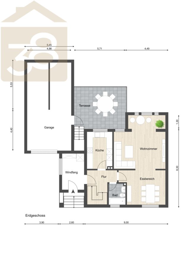 Beim Betreten des Hauses gelangt man in einen Eingangsbereich im Erdgeschoss, von dem aus die weiteren Räume erschlossen werden. Das Badezimmer auf dieser Ebene ist mit einer Ebenerdigen Dusche sowie einem Fenster ausgestattet und sorgt für ausreichend Tageslicht. Der Essbereich geht offen in das Wohnzimmer über, wodurch eine freundliche und kommunikative Wohnatmosphäre entsteht. Die vorhandene üche bietet eine solide Grundlage und kann je nach Bedarf modernisiert werden. Von hier aus besteht Zugang zur Terrasse und in den Garten, der vielfältige Nutzungsmöglichkeiten eröffnet – sei es für Erholung, Gartenarbeit oder gesellige Stunden im Freien.
