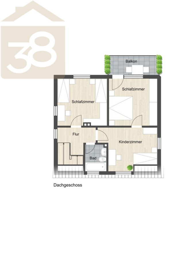 Im Dachgeschoss befinden sich das Schlafzimmer sowie zwei weitere Zimmer, die flexibel als Kinder-, Gäste- oder Arbeitszimmer genutzt werden können. Zusätzlich steht ein Balkon zur Verfügung, der einen angenehmen Rückzugsort im Außenbereich bietet.