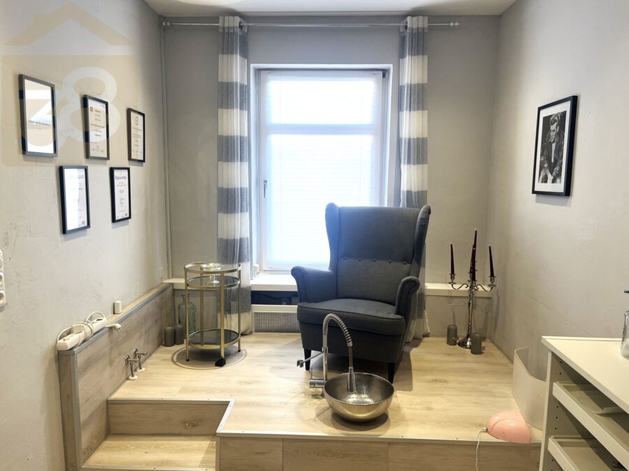 Im EG befindet sich eine Gewerbefläche mit einer Nutzfläche von 81 m². Sie besteht aus einem Ladengeschaft inklusive Lager, Aufenthaltsraum und WC. Seit 2021 wird hier ein Nagelstudio betrieben welches ab dem 01.11.2025 leerstehen wird. Es kann weiterhin als Gewerbefläche genutzt werden oder wahlweise unproblematisch in eine Wohneinheit umgewandelt werden. Das Erdgeschoss verfügt bereits über ein eigenes Bad. Die Netto-Kaltmiete beträgt aktuell noch 500,00 €.