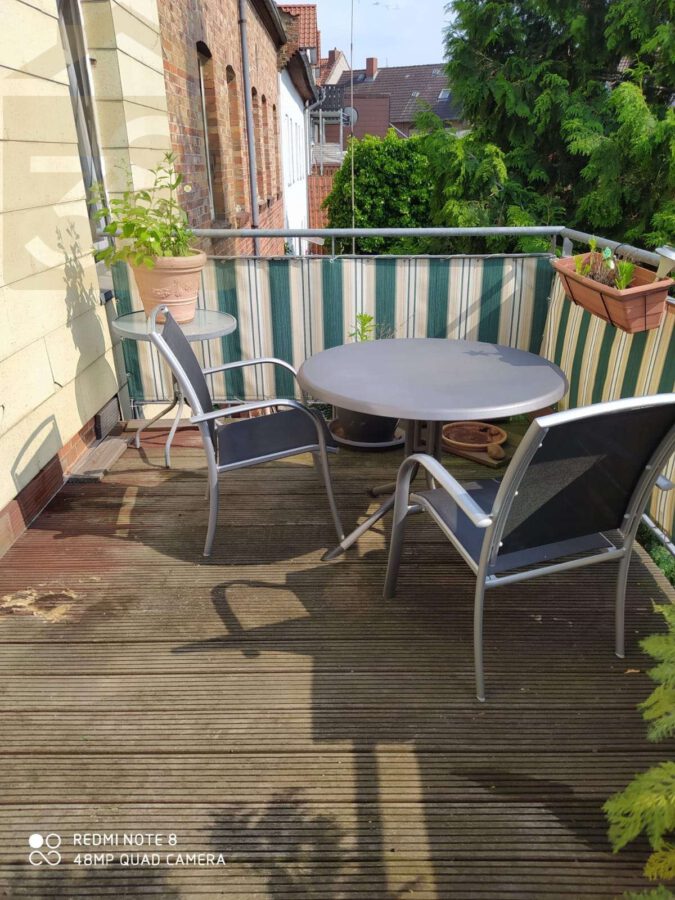 - großzügiger Balkon auf Stahlträgern mit Tisch, Abdeckung und Markise