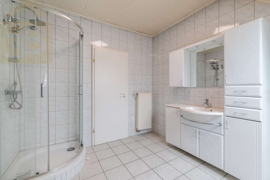 Beide Wohnungen sind hell, freundlich und gepflegt. Die Böden sind einheitlich mit weißen Fliesen versehen, was den Räumen ein modernes und lichtdurchflutetes Ambiente verleiht. Jede Wohneinheit verfügt über eine eigene Küche, ein großes Wohnzimmer, zwei Schlafzimmer, einen Abstellraum sowie ein Badezimmer mit Eckbadewanne und separater Dusche.