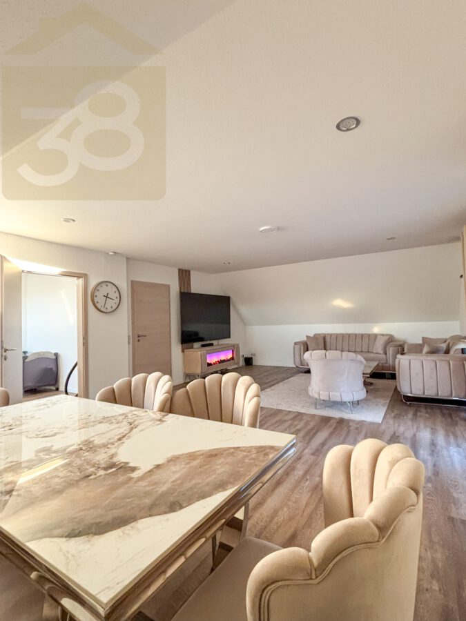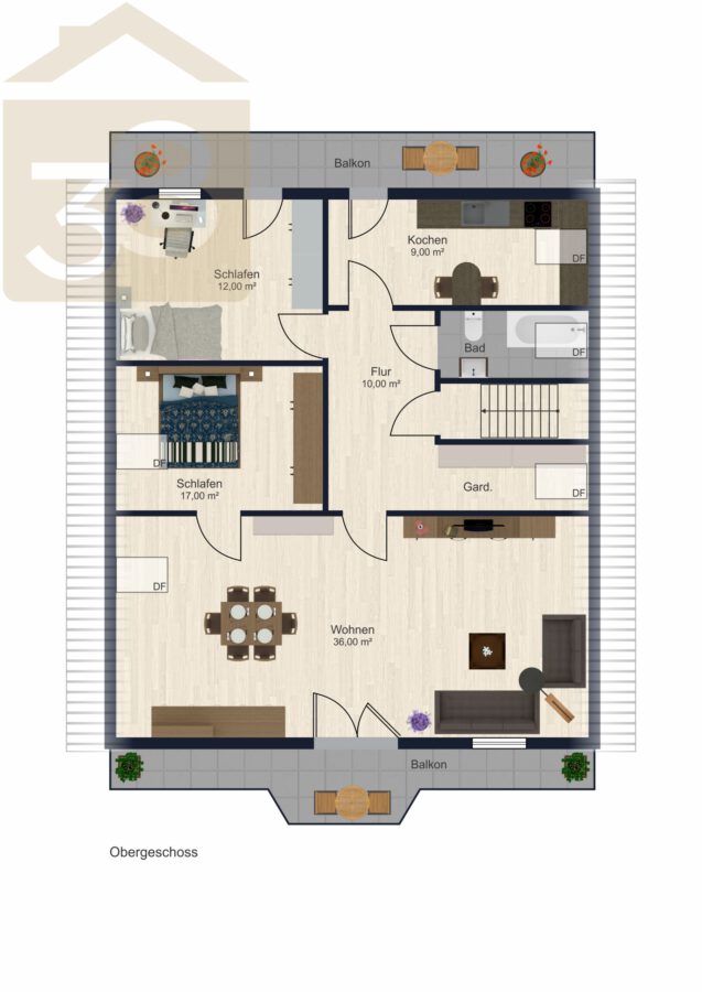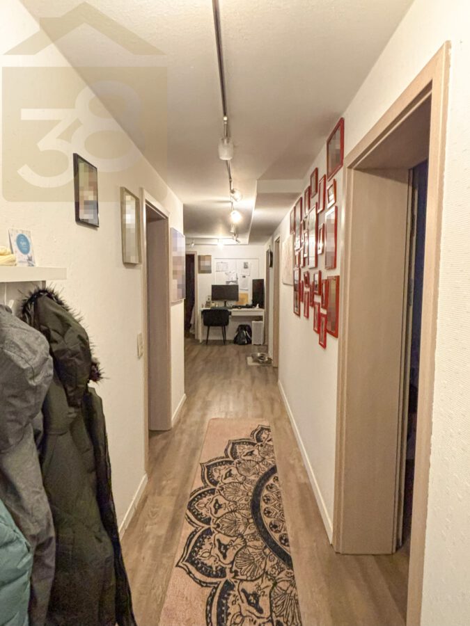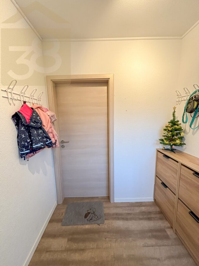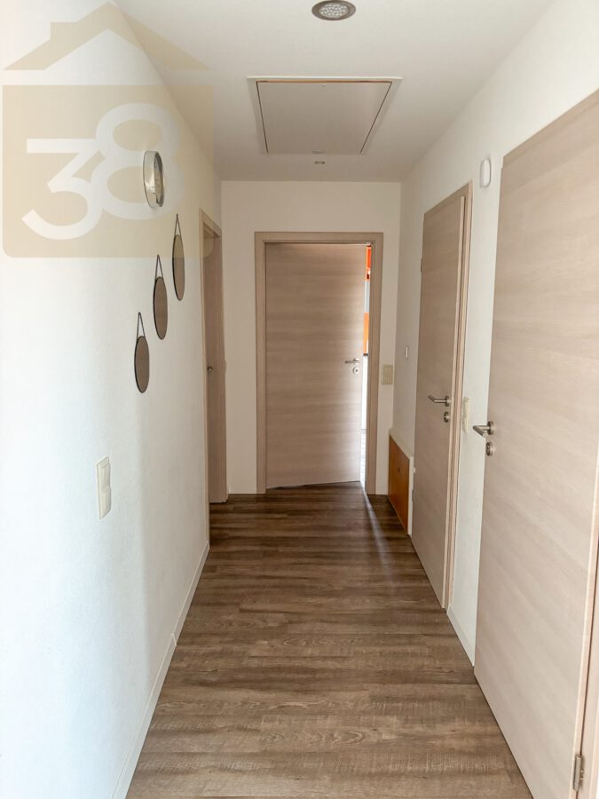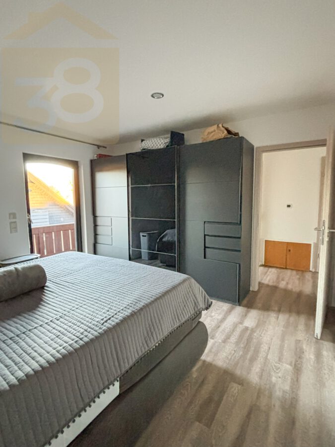 Das Obergeschoss bietet ca. 93 m² Wohnfläche und überzeugt durch eine funktionale Aufteilung. Der Flur mit Garderobenbereich führt in die weiteren Räume, darunter ein Abstellraum, eine Küche mit Einbauküche und Zugang zu einem Balkon, zwei Schlafzimmer – eines davon ebenfalls mit Balkonzugang – sowie ein lichtdurchflutetes Wohnzimmer mit Essbereich und einem weiteren Balkon.