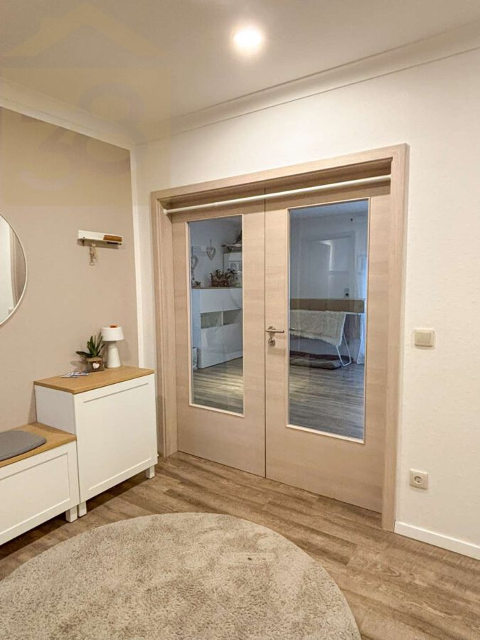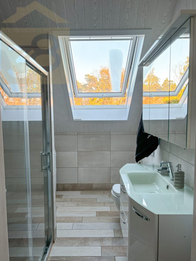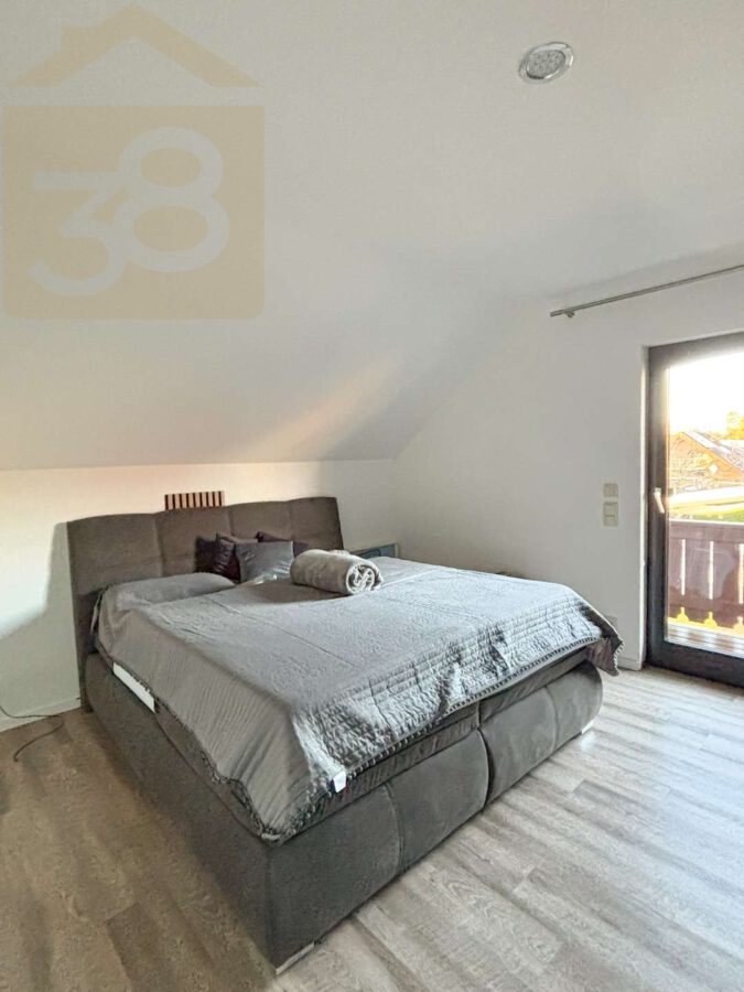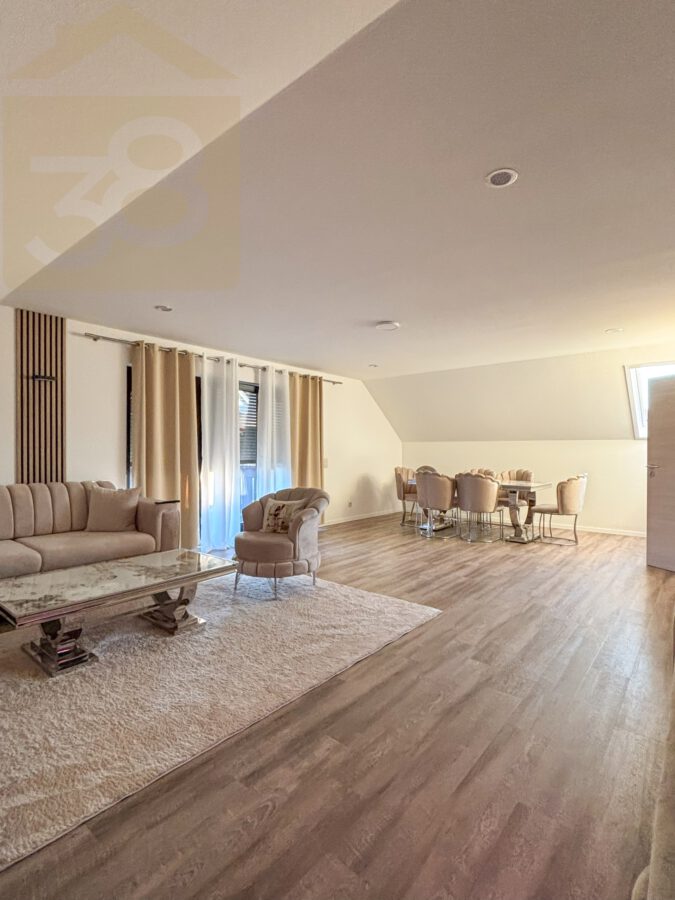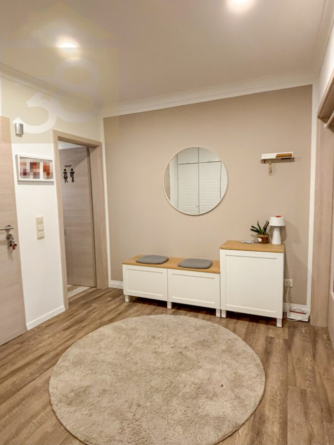 Das Obergeschoss bietet ca. 93 m² Wohnfläche und überzeugt durch eine funktionale Aufteilung. Der Flur mit Garderobenbereich führt in die weiteren Räume, darunter ein Abstellraum, eine Küche mit Einbauküche und Zugang zu einem Balkon, zwei Schlafzimmer – eines davon ebenfalls mit Balkonzugang – sowie ein lichtdurchflutetes Wohnzimmer mit Essbereich und einem weiteren Balkon.