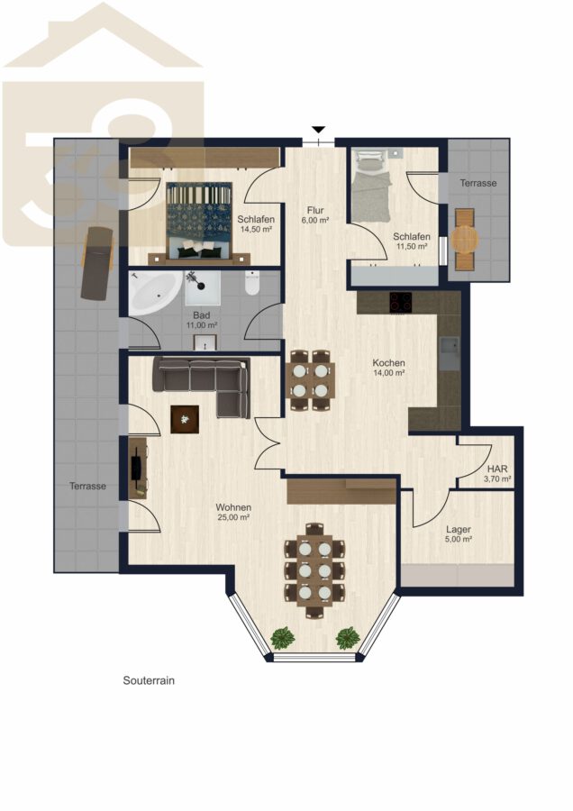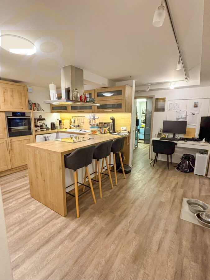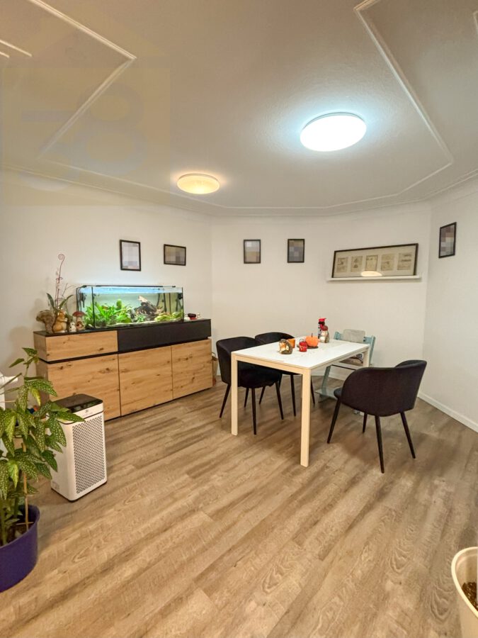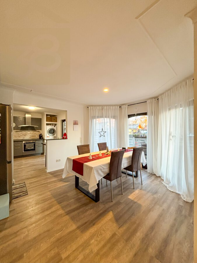 Die Wohnung im Souterrain umfasst ca. 100 m² Wohnfläche und überzeugt durch eine durchdachte Raumaufteilung. Zwei Schlafzimmer bieten ausreichend Rückzugsmöglichkeiten, während das moderne Badezimmer mit Eckbadewanne, begehbarer Dusche und WC einen hohen Komfort bietet. Die Küche ist mit einer Einbauküche ausgestattet und verfügt über einen gemütlichen Essbereich. Das großzügige Wohnzimmer mit direktem Zugang zu einer Terrasse schafft eine angenehme Wohnatmosphäre. Zusätzlich stehen ein Lagerraum und ein Hauswirtschaftsraum zur Verfügung.