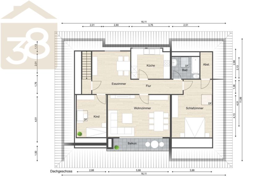 Das Dachgeschoss, das im Jahr 1973 ausgebaut wurde, verfügt über ca. 90 m² Wohnfläche und drei Zimmer. Hier befinden sich ein Flur, ein Esszimmer, eine Küche mit Einbauküche, ein Badezimmer mit Dusche, ein Schlafzimmer sowie ein Wohnzimmer mit Zugang zum Balkon. Ein weiteres Zimmer kann als Kinder- oder Arbeitszimmer genutzt werden. Eine elektronische Haustür-Schließanlage sorgt im Obergeschoss für zusätzlichen Komfort und Sicherheit.