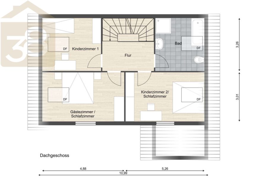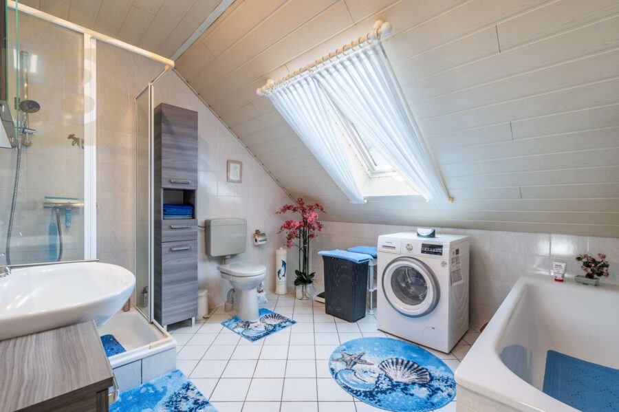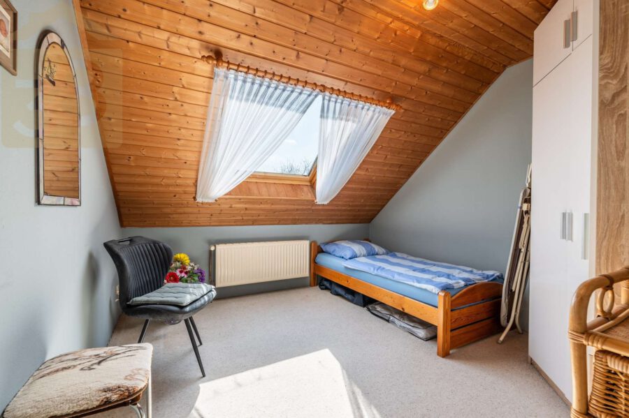Im Dachgeschoss befinden sich ein geräumiges Schlafzimmer sowie zwei weitere Zimmer, die flexibel als Kinder-, Gäste- oder Arbeitszimmer genutzt werden können. Das Badezimmer ist komfortabel ausgestattet und verfügt über eine Dusche, eine Badewanne sowie ein WC. Ein zusätzlicher Abstellraum sorgt für praktischen Stauraum im Alltag.