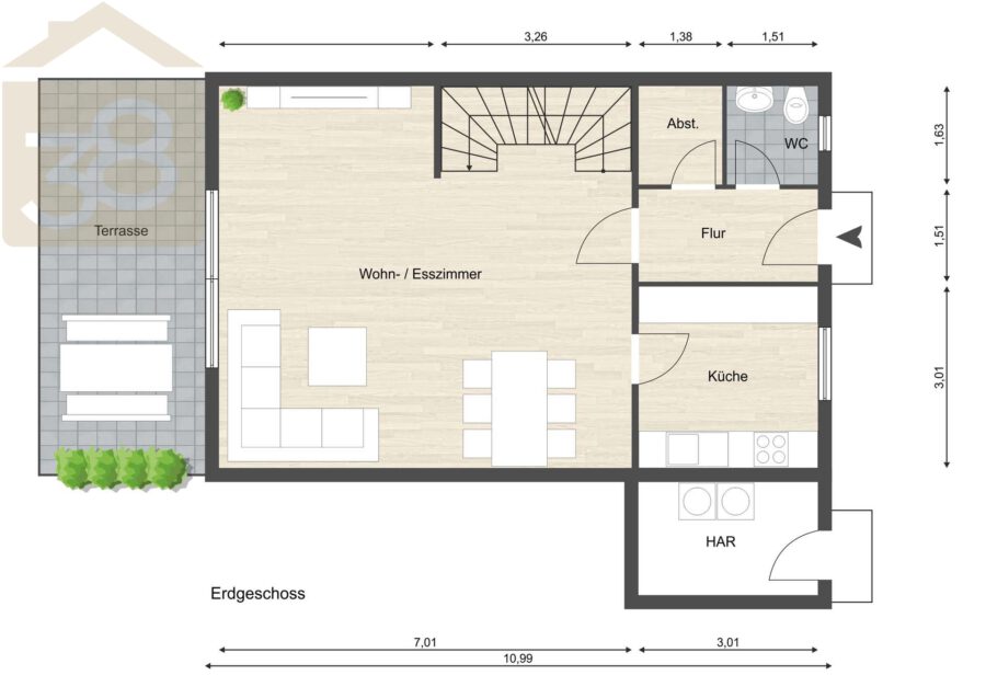 Bereits beim Betreten des Hauses empfängt Sie der Eingangsbereich, von dem aus Sie in das großzügige und lichtdurchflutete Wohnzimmer gelangen. Der offen gestaltete Wohn- und Essbereich schafft eine einladende Atmosphäre und bietet viel Raum für gemeinsame Stunden. Von hier aus haben Sie direkten Zugang zur Terrasse und in den gepflegten Garten, der zum Entspannen und Verweilen im Freien einlädt. Die Küche ist mit einer Einbauküche ausgestattet und funktional geschnitten. Ein Gäste-WC im Erdgeschoss rundet das Raumangebot auf dieser Ebene ab.