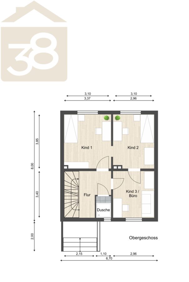 Im Obergeschoss befinden sich drei weitere Zimmer lassen sich flexibel als Kinder-, Arbeits- oder Gästezimmer nutzen und passen sich somit ideal Ihren individuellen Bedürfnissen an. Ein modernes Duschbad komplettiert diese Etage.