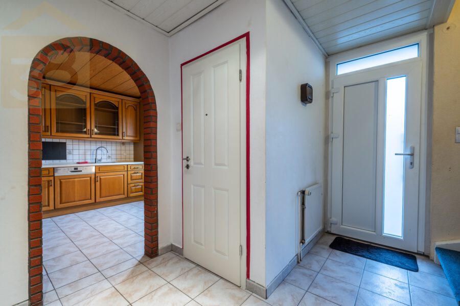 Bereits beim Betreten des Hauses empfängt Sie ein einladender Eingangsbereich mit Gäste-WC. Von hier aus gelangen Sie in das helle und großzügige Wohnzimmer, das mit einem Kaminofen eine behagliche Atmosphäre schafft und besonders in der kühleren Jahreszeit für wohlige Wärme sorgt. Die Küche ist mit einer Einbauküche ausgestattet und bietet ausreichend Platz für den Familienalltag. Über den Treppenaufgang erreichen Sie die oberen Etagen des Hauses.