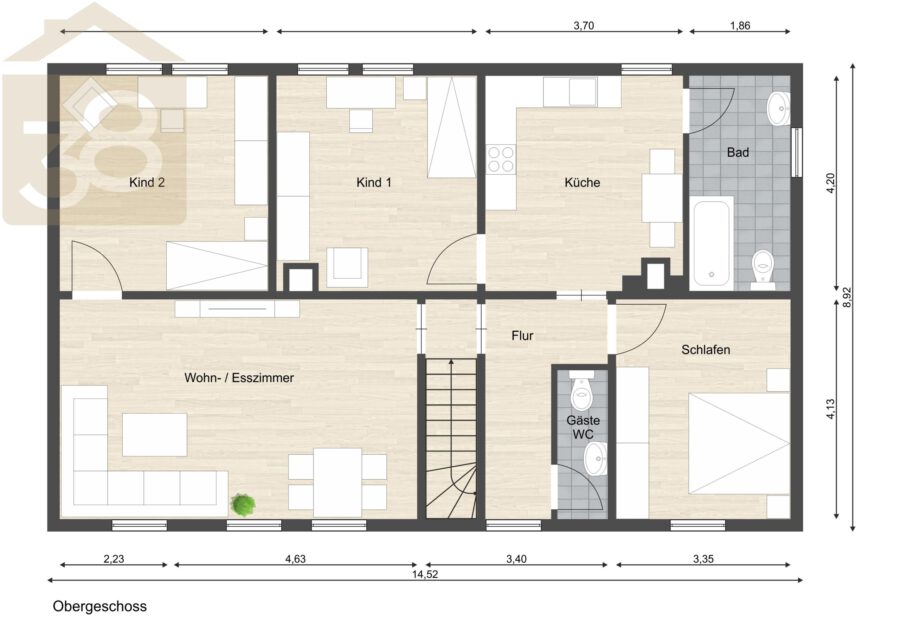 Im Obergeschoss erwartet Sie ebenfalls ein Wohnzimmer, zwei Schlafzimmer, ein Kinder-/Arbeitszimmer, eine separate Küche, die bereits mit einer Einbauküche ausgestattet ist, sowie ein Tageslichtbadezimmer mit Badewanne und WC. Ergänzend findet sich hier ein Gäste-WC.