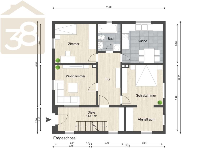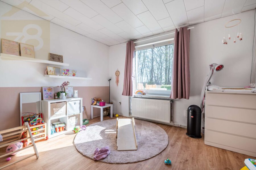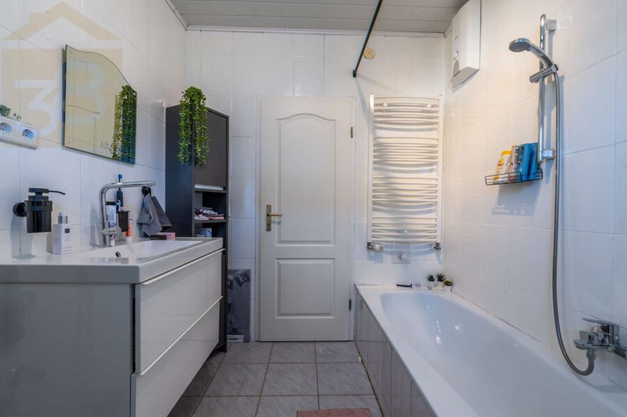 Im Erdgeschoss empfängt ein Eingangsbereich mit anschließendem Flur die Bewohner und Gäste. Von hier aus sind alle Räume der Wohnung bequem erreichbar. Das großzügige Wohnzimmer bildet den zentralen Aufenthaltsbereich und bietet viel Platz für eine gemütliche Wohnatmosphäre. Ergänzt wird die Ebene durch ein Schlafzimmer, eine Küche sowie ein Badezimmer mit Badewanne. Ein weiteres Zimmer kann flexibel als Kinderzimmer, Arbeitszimmer oder Gästezimmer genutzt werden. Zusätzlich steht ein praktischer Abstellraum zur Verfügung, der wertvollen Stauraum im Alltag bietet.