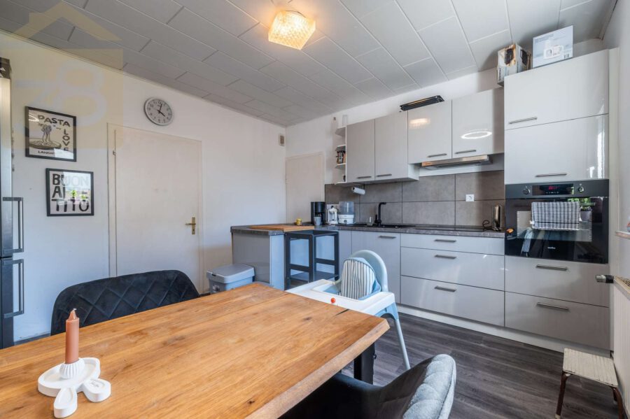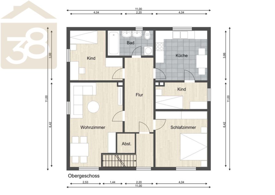 Das Obergeschoss verfügt über eine eigenständige Wohneinheit. Hier befinden sich ein Wohnzimmer, eine Küche und ein Badezimmer sowie drei weitere Zimmer, die sich ideal als Kinder-, Schlaf- oder Gästezimmer eignen. Durch die durchdachte Raumaufteilung bietet auch diese Etage vielseitige Nutzungsmöglichkeiten für Familien oder Mieter.