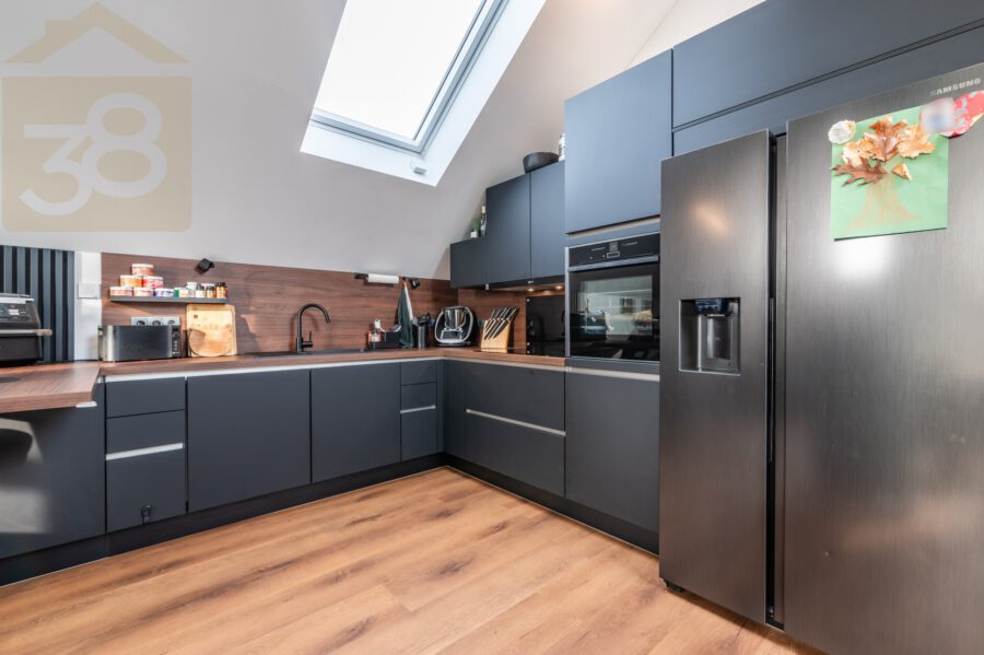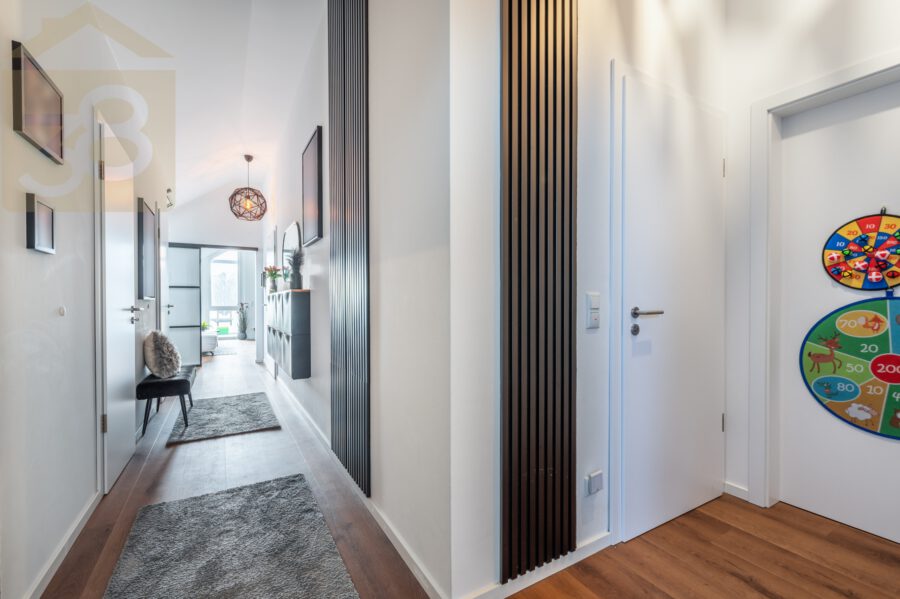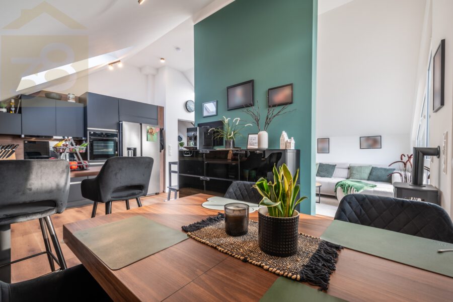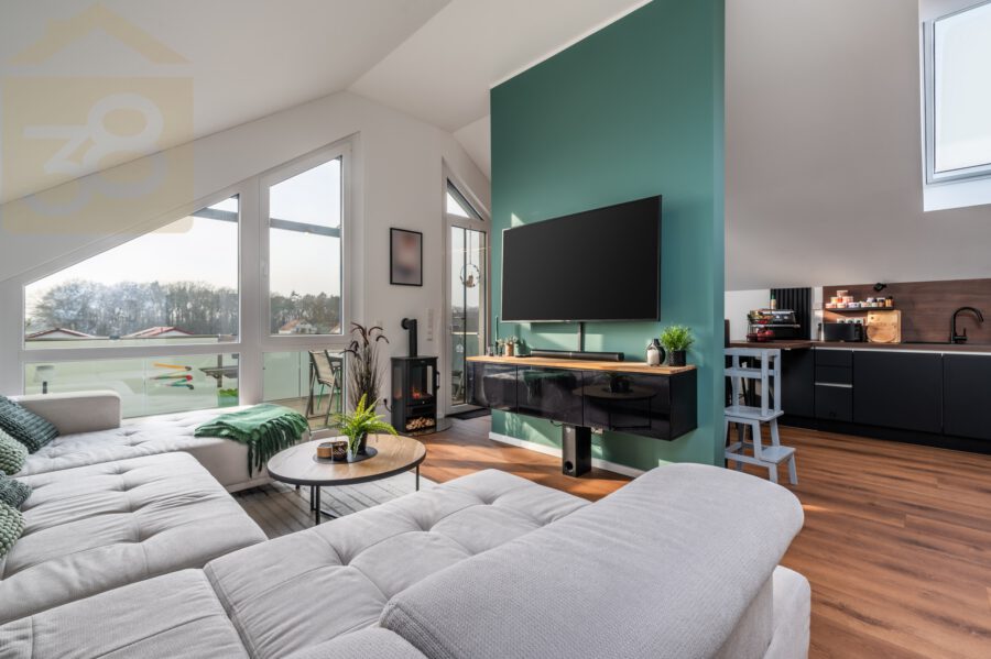 Besonders hervorzuheben ist das großzügige, lichtdurchflutete Wohnzimmer, das durch die offene Küche und die großen Fensterflächen eine moderne, einladende Atmosphäre schafft. Die hochmoderne Küche ist ein wahres Highlight und lässt keine Wünsche offen.