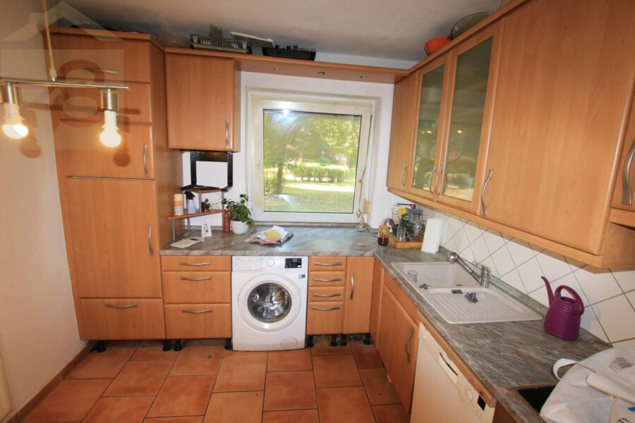 Die Ausstattung ist derzeit einfach gehalten, jedoch bietet dies die perfekte Gelegenheit, Ihre eigenen Wünsche und Vorstellungen umzusetzen. Die Böden sind mit einer Kombination aus Fliesen und Laminat versehen, was eine gute Basis für mögliche Renovierungspläne darstellt.