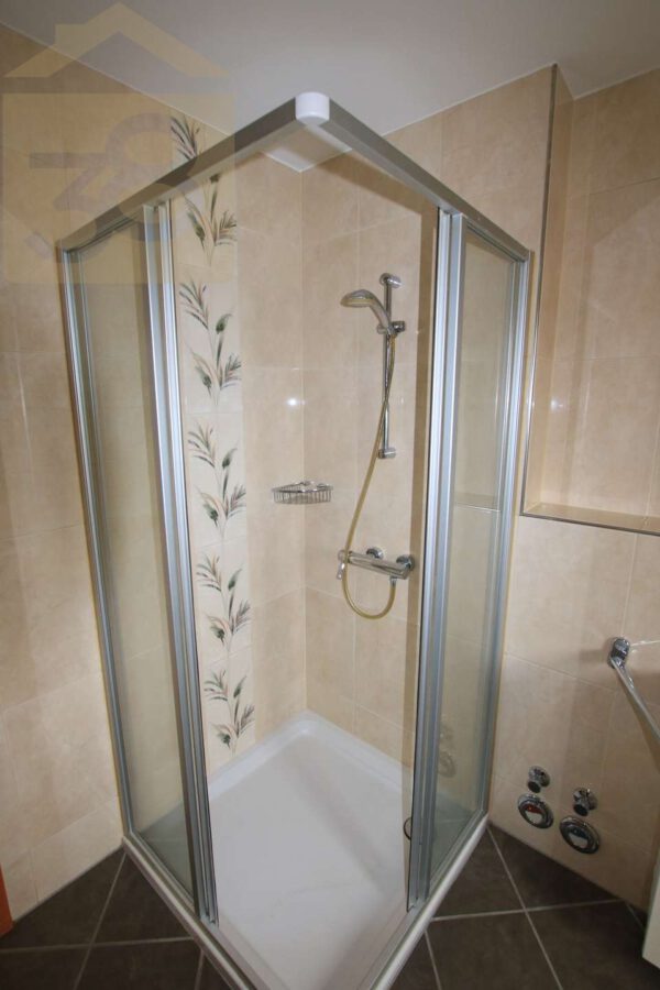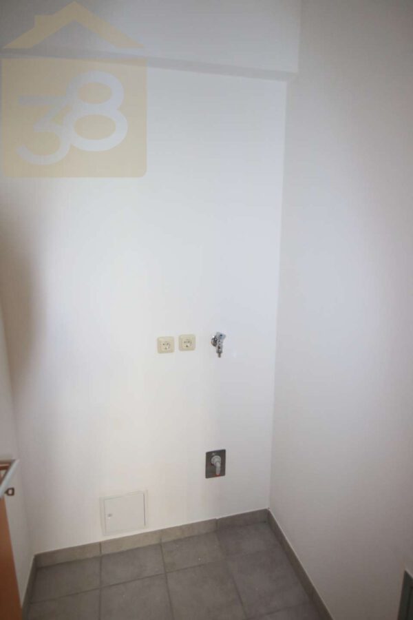 Im Küchenbereich ist eine Einbauküche bereits integriert. Ein praktischer Abstellraum innerhalb der Wohnung, der auch Anschlüsse für Waschmaschine und Trockner bereithält, sorgt für Ordnung und kurze Wege. Das Badezimmer lässt keine Wünsche offen: Es ist sowohl mit einer modernen Dusche als auch einer gemütlichen Eckbadewanne ausgestattet. Ergänzend steht ein separates Gäste-WC zur Verfügung. Die Böden sind mit einer Kombination aus Laminat und Fliesen versehen.