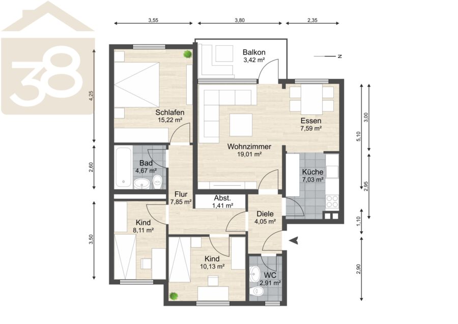 Der Grundriss der Vier-Zimmerwohnung ist gelungen und durchdacht. Das Wohnzimmer ist großzügig und bietet eine Essecke am Fenster. Der Balkon ist überdacht und beim Blick ins Grüne können sie entspannen. Die Küche ist bereits mit einer Einbauküche und allen Geräten ausgestattet. Über einen weiteren Flur gelangen Sie in den Schlaftrakt, in dem Sie ein Schlafzimmer sowie zwei Kinderzimmer erwarten. Das Badezimmer ist mit einer Badewanne ausgestattet und das Gäste-WC mit einer ebenerdigen Dusche. Ein praktischer Abstellraum bietet sich als Stauraum an. Selbstverständlich gehört auch ein eigenes Kellerabteil zur Wohnung.