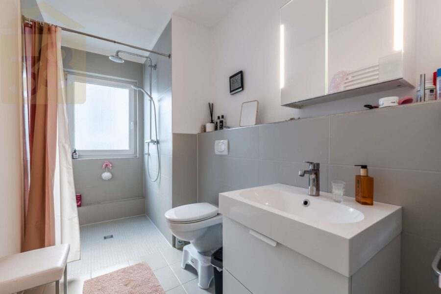 Das modern gestaltete Badezimmer verfügt über eine ebenerdige Dusche und entspricht dem aktuellen Wohnkomfort. Die Küche ist mit einer Einbauküche ausgestattet und bietet ausreichend Arbeits- und Stauraum.