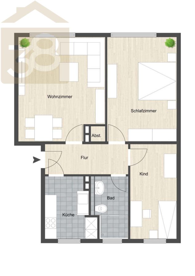 Die Wohnung selbst zeichnet sich durch einen funktionalen Grundriss aus. Über den zentral gelegenen Flur sind sämtliche Räume bequem erreichbar. Das helle Wohnzimmer bietet ausreichend Platz für einen Wohn- und Essbereich und lädt zum Verweilen ein. Ergänzt wird das Raumangebot durch ein Schlafzimmer sowie ein weiteres Zimmer, das sich ideal als Kinderzimmer oder Homeoffice eignet. Eine kleine Abstellnische sorgt für zusätzlichen Stauraum im Alltag.