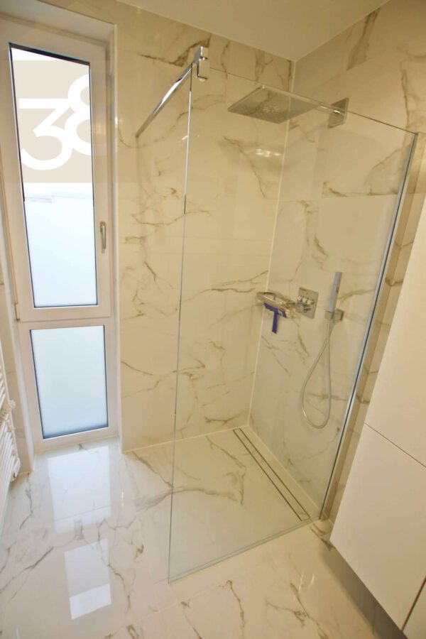 Das Schlafzimmer bietet ausreichend Platz für individuelle Gestaltungsmöglichkeiten und schafft eine angenehme Rückzugsoase. Das stilvolle Badezimmer verfügt über eine ebenerdige Dusche, WC sowie ein Bidet und ist – ebenso wie die Küche – mit eleganten Marmorfliesen versehen. Für besonderen Komfort sorgt die private Sauna innerhalb der Wohnung, die ein exklusives Wellnesserlebnis in den eigenen vier Wänden ermöglicht.