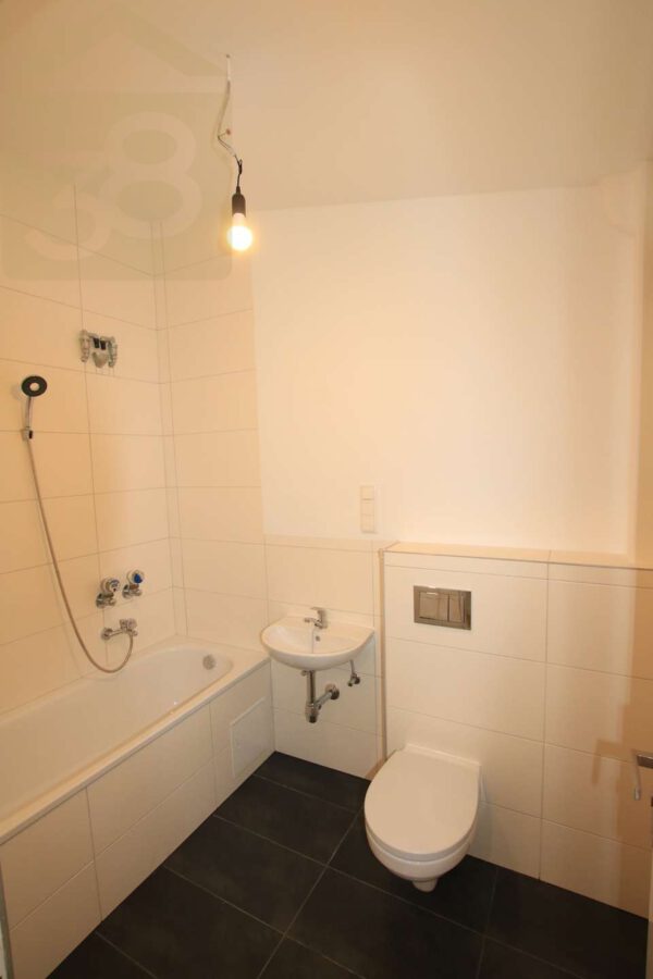 Das modern gestaltete Badezimmer ist mit einer Badewanne ausgestattet und lädt zum Wohlfühlen ein. Ein praktischer Abstellraum innerhalb der Wohnung sorgt zusätzlich für wertvollen Stauraum und unterstreicht die Funktionalität des Grundrisses.
